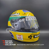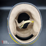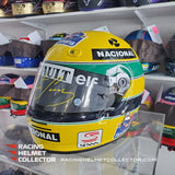 An incredibly rare Ayrton Senna tribute helmet with Ayrton Senna Signed Tear-Off Visor, 1994 Race Worn. Mounted on a highly accurate reproduction of Senna's famous helmet was painted on an original BELL M3 helmet dating from 1994. Exact Bell M3 replica used by Senna with date code 5-94 (month and year of Ayrton Senna's death date). Fins top rear & the vents are cut above the Nacional which is special and is the specs Ayrton used during his Williams France testing the week before his passing in Imola, Italy on May 1st of 1994.