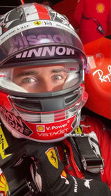 Description: This visor was actually worn on track by Charles Leclerc during the 2021 F1 season with Ferrari. The race worn / track worn visor is now mounted on a beautifully and newly painted, premium, full-size display helmet. Giving homage to Charles Leclerc's 2020 season with the Ferrari Team.
