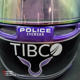 This historical F1 piece is extremely rare. This visor was race worn by Lewis Hamilton in 2020 during his time with Mercedes AMG F1. The visor is an original race used Bell HP77 worn by Lewis Hamilton during the 2020 race season. The special tinted visor still bears multiple tear-offs with "Police Eyewear" sponsorship at the pull tabs. The visor has been mounted on a beautifully painted Black & Purple promo helmet.