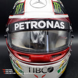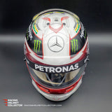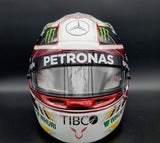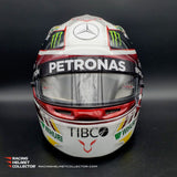 Story: Directly from the Mercedes shop, as close to the source as it gets. Whilst Hamilton normally does not sign replica helmets, as this was purposely commissioned by one of the mechanics working at the Mercedes team and the paint job was 'better than normal' in Hamilton's words he was happy to sign it for his colleague. This helmet was track worn by a mechanic several times at Mercedes' teams' karting events.