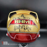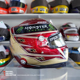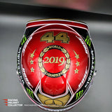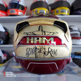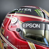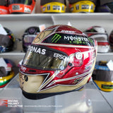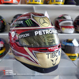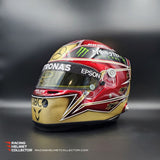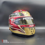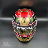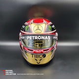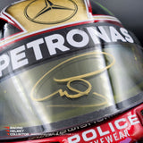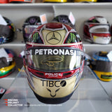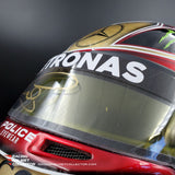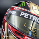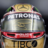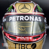 Lewis Hamilton Signed Race Worn Helmet Visor 2021 Mounted On 2019 Gold Abu Dhabi Promo Helmet Full Scale AS-02819