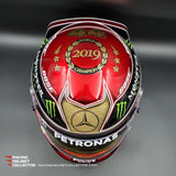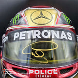 This historical F1 piece is extremely rare. This visor was race worn by Lewis Hamilton in 2021. Autographed by Lewis Hamilton in gold paint pen.  And subsequently, mounted onto a 2019 Gold Abu Dhabi GOLD Promo Helmet