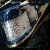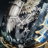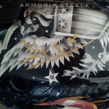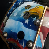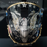This masterpiece of a mask is the emblem of strength and ferocity, with the majestic eagle sweeping down from its left side. Genuine diamonds and authentic Swarovski crystals are encrusted in the eye and wings of the eagle, the guardian of Freedom. The opposite side of the mask is glorified by the “Miracle on Ice”, a historic moment in which the team consisting of amateur and college players masterfully defeated the national powerhouse team of the Soviet Union in the 1980 Olympic Games . It was a victory of utmost brilliance that is still imprinted in the hearts of all Americans today. The United States of America coat of arms proudly poises the top of the mask, elegantly tinted in silver chrome brilliance.
