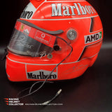 Description: This visor was actually worn on track by Michael Schumacher during his time with the Ferrari Team in 2005. The race worn / track worn visor is now mounted on a beautifully and newly painted, premium, full-size display helmet. The race used visor still sports its original defog system and original tear off.